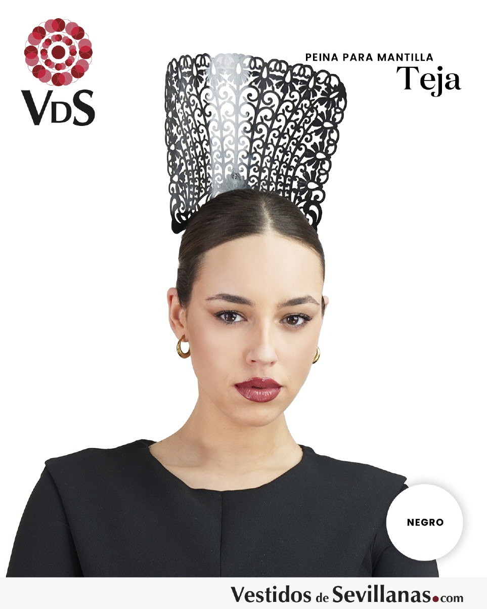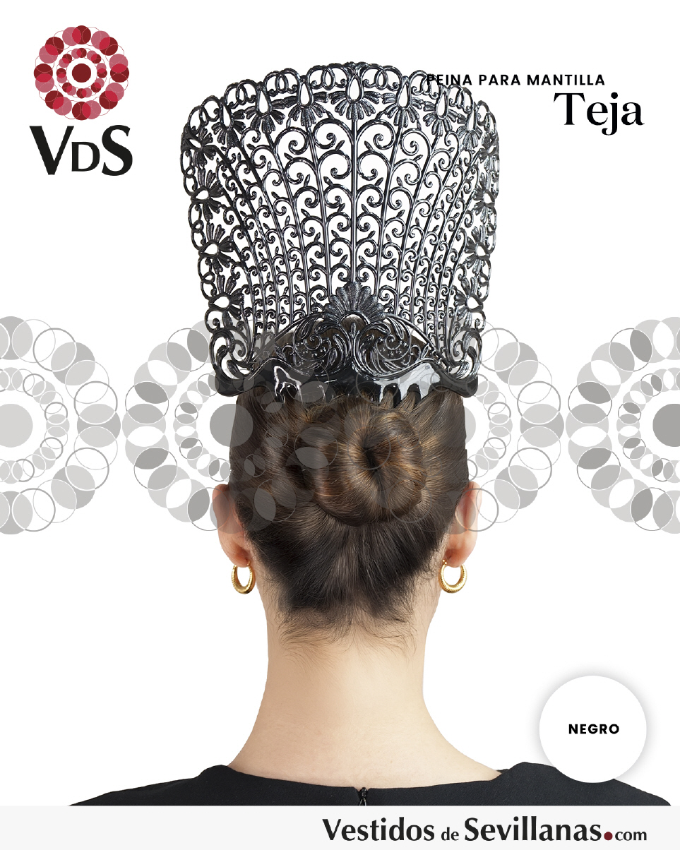 La Peineta TEJA grande, alta, curvada y labrada, que se lleva en la parte posterior de la cabeza para sostener una mantilla rectangular de encaje.