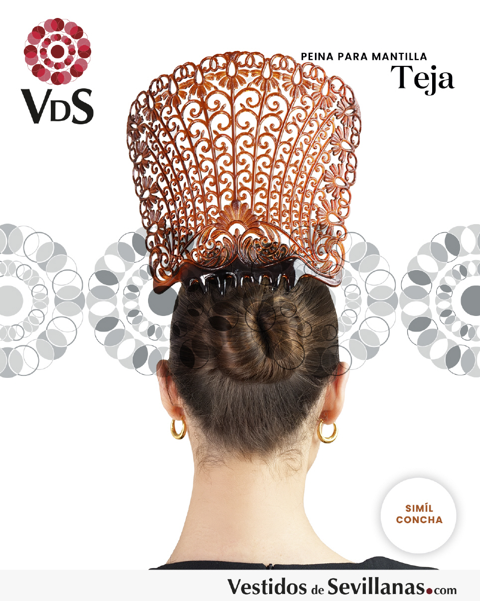 La Peineta TEJA grande, alta, curvada y labrada, que se lleva en la parte posterior de la cabeza para sostener una mantilla rectangular de encaje.