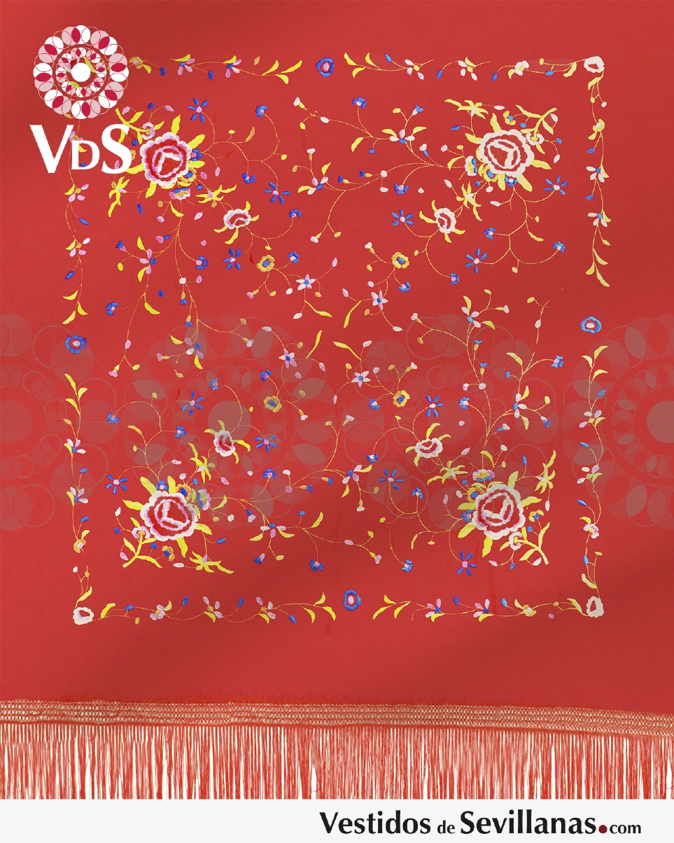 Confeccionado/bordado a máquina en tejido sedoso, con algo de brillo. Pasamanería y flecos en punto.