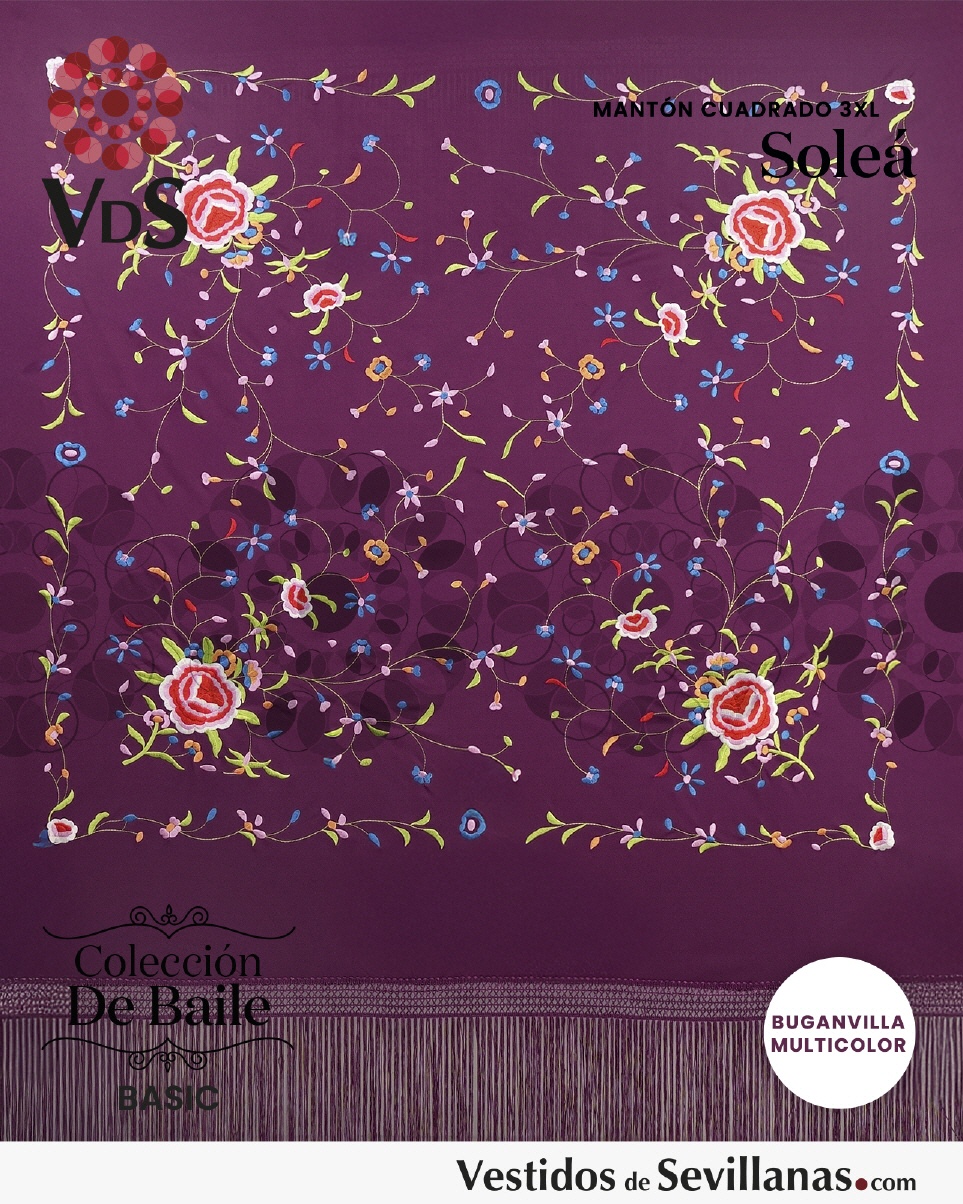 Mantón SOLEÁ bordado grande cuadrado con flecos, Buganvilla con flores bordadas Multicolor.
