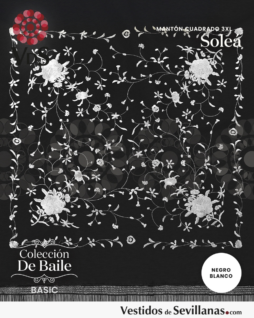 Mantón SOLEÁ bordado grande cuadrado con flecos, negro con flores bordadas blancas.