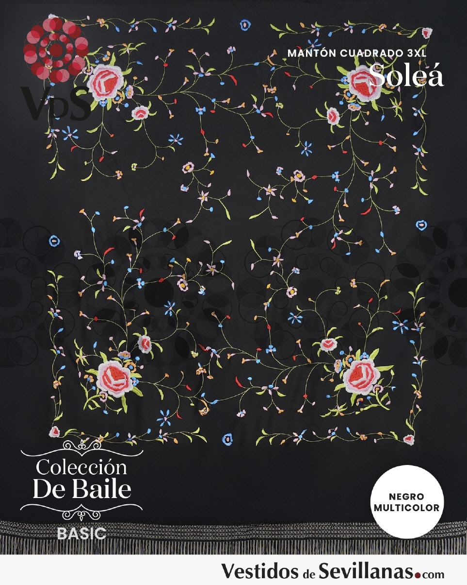Mantón SOLEÁ bordado grande cuadrado con flecos, Negro con flores bordadas multicolor.