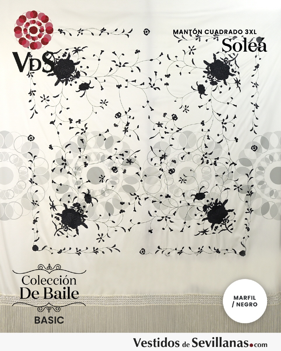 Mantón SOLEÁ bordado grande cuadrado con flecos, Marfil con flores bordadas negras.