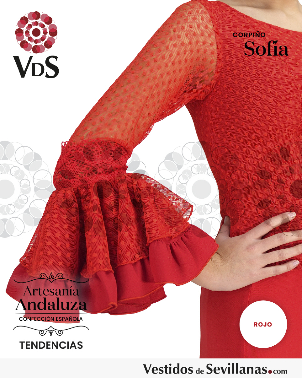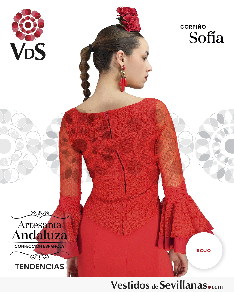 Corpiño SOFÍA flamenco Plumeti, escote barca, mangas con volantes.