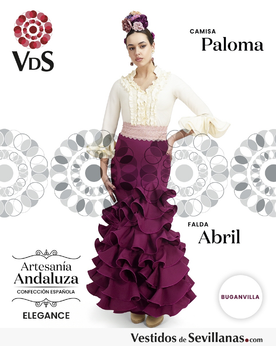 Falda larga flamenca ABRIL, entallada con ocho volantes en cascada.