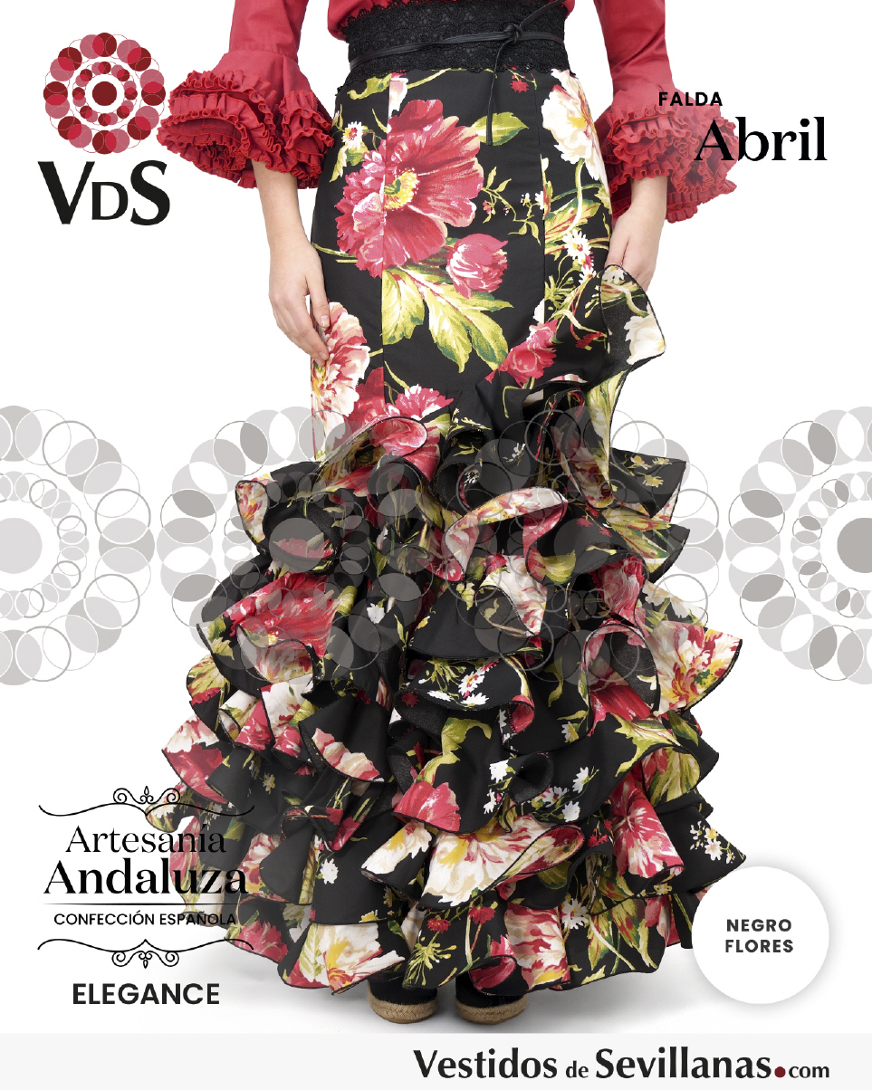 Falda larga flamenca ABRIL, entallada con ocho volantes en cascada.