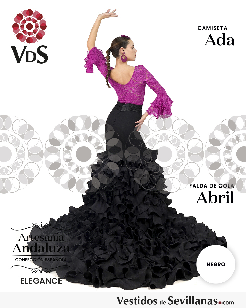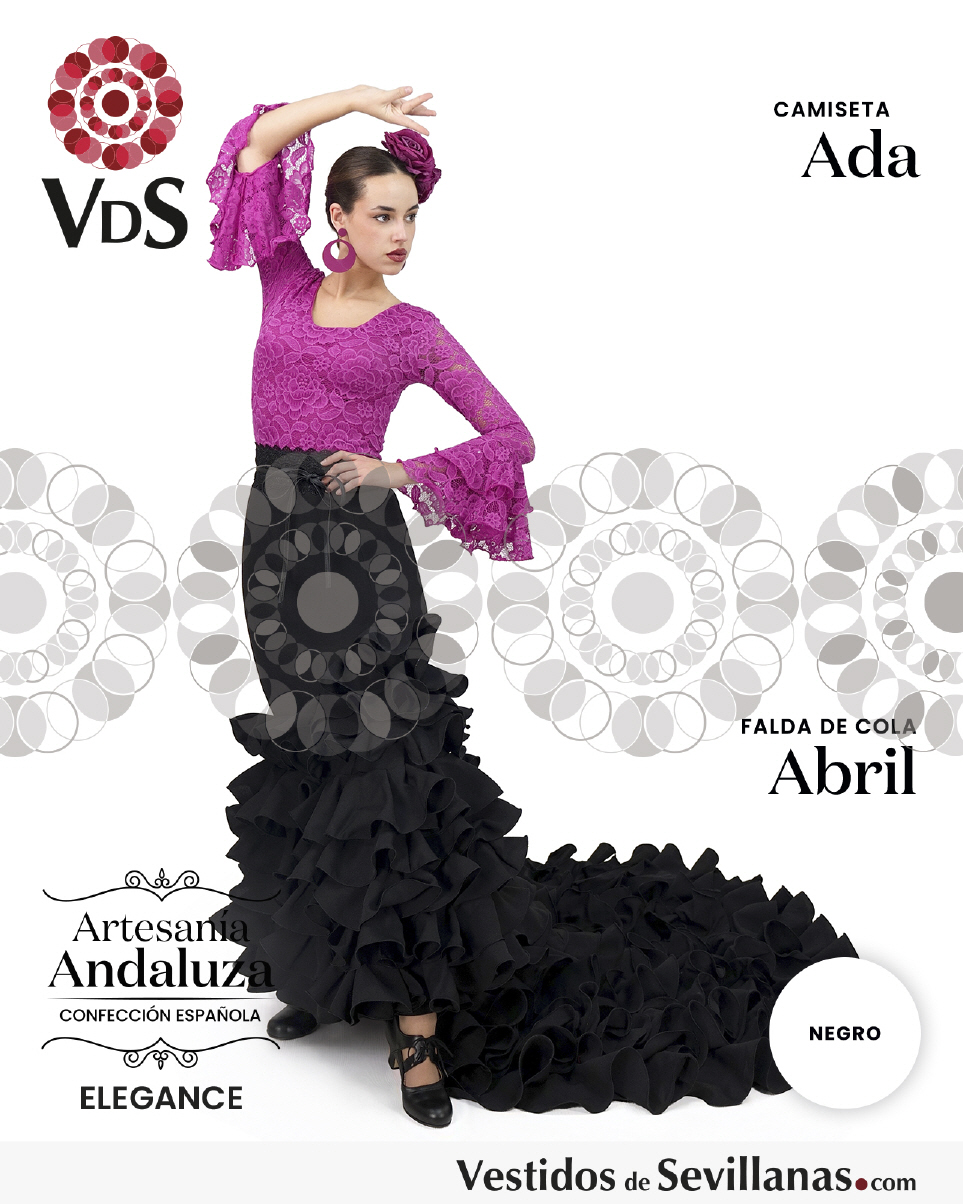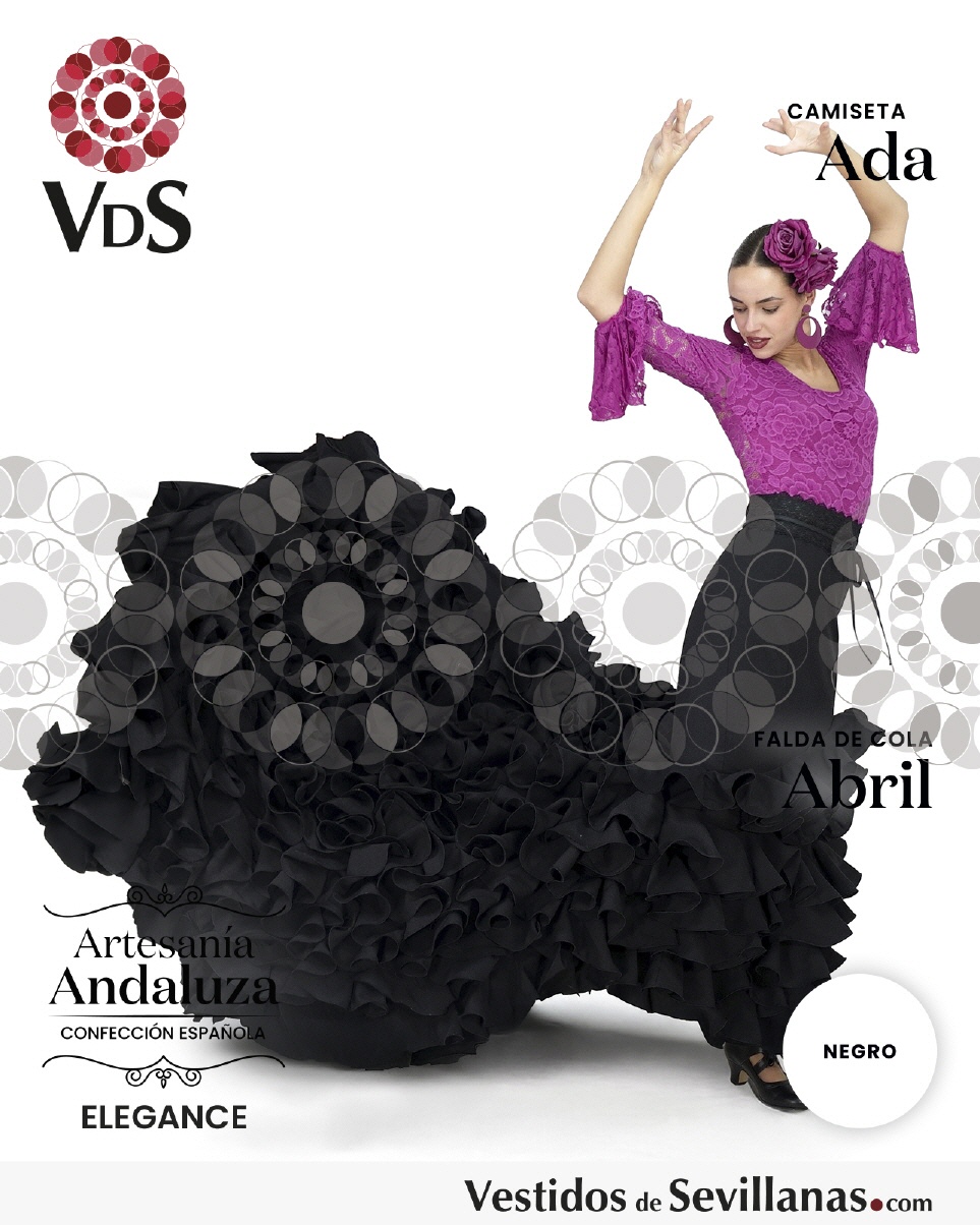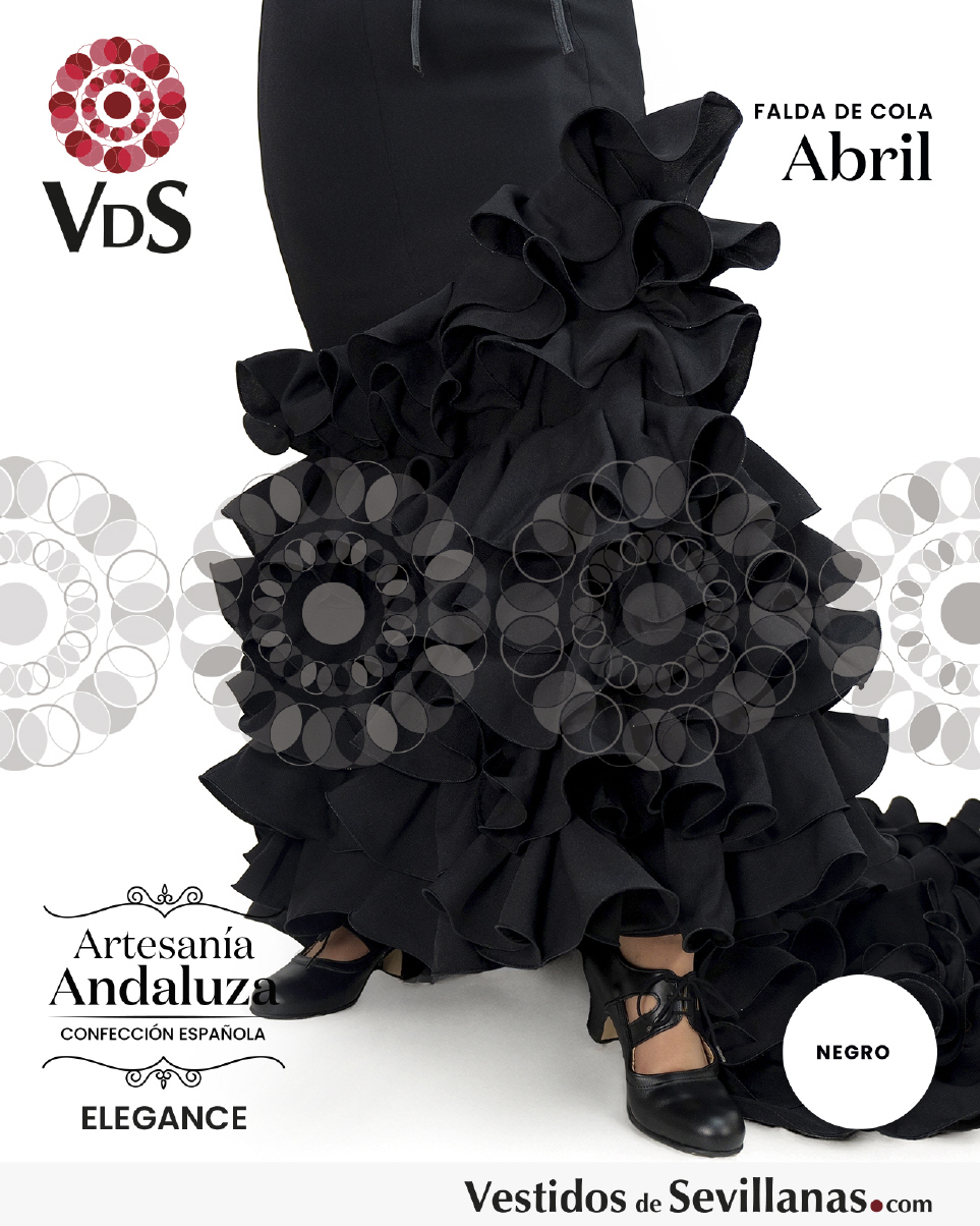 Falda de cola para baile flamenco en color negro con tul negro/buganvilla.