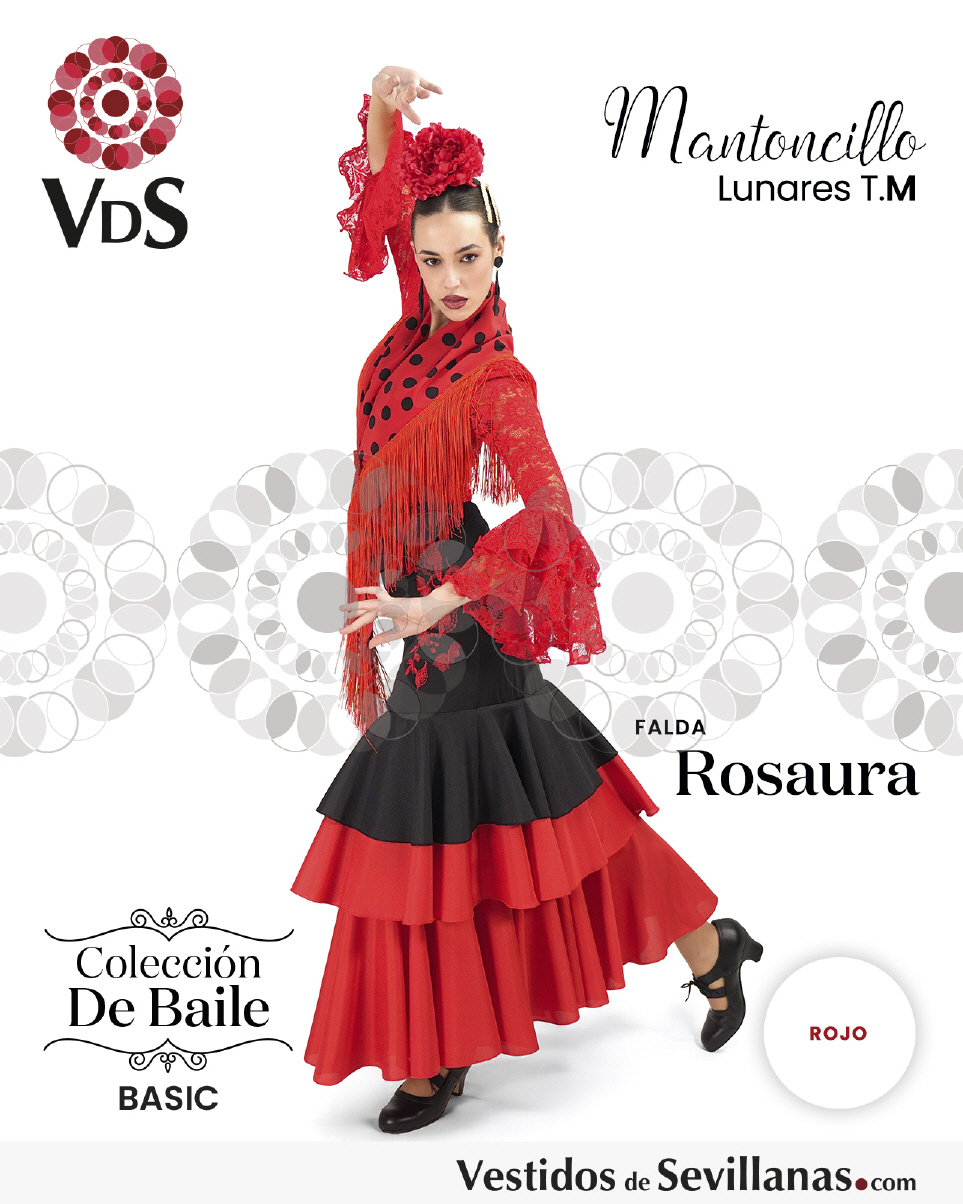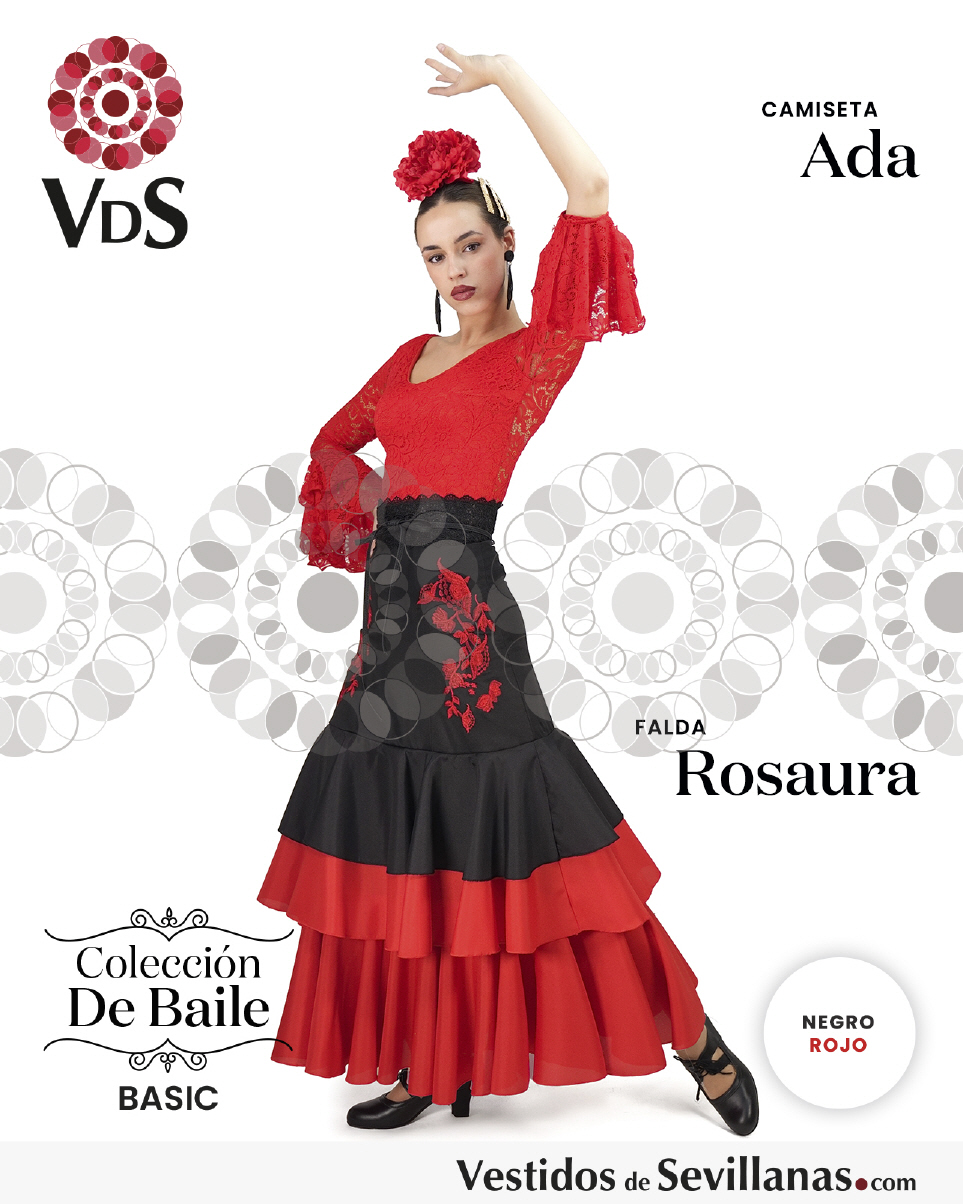 Falda ROSAURA para baile flamenco entallada a cadera en color negro/rojo, con flores bordadas en la cadera.