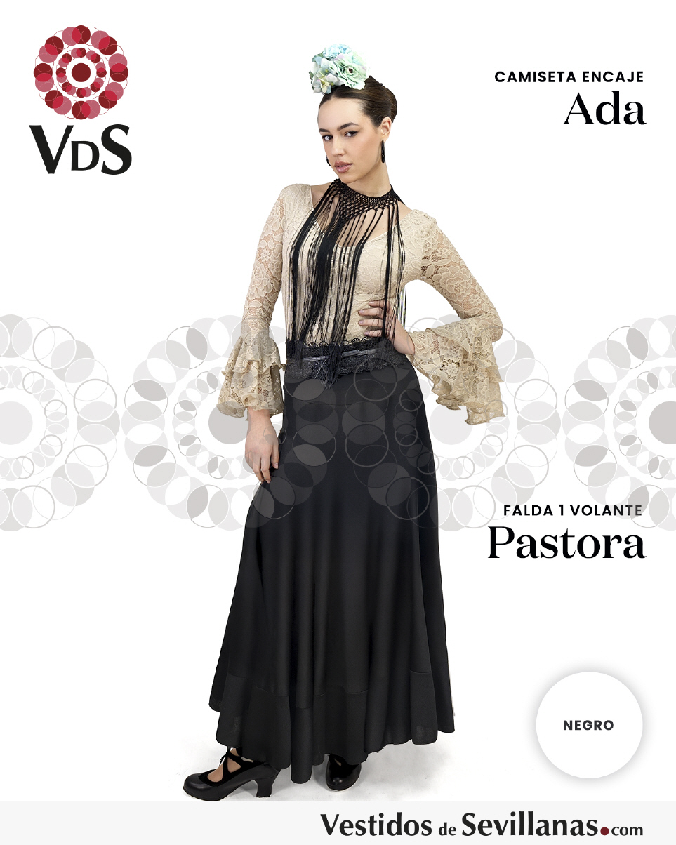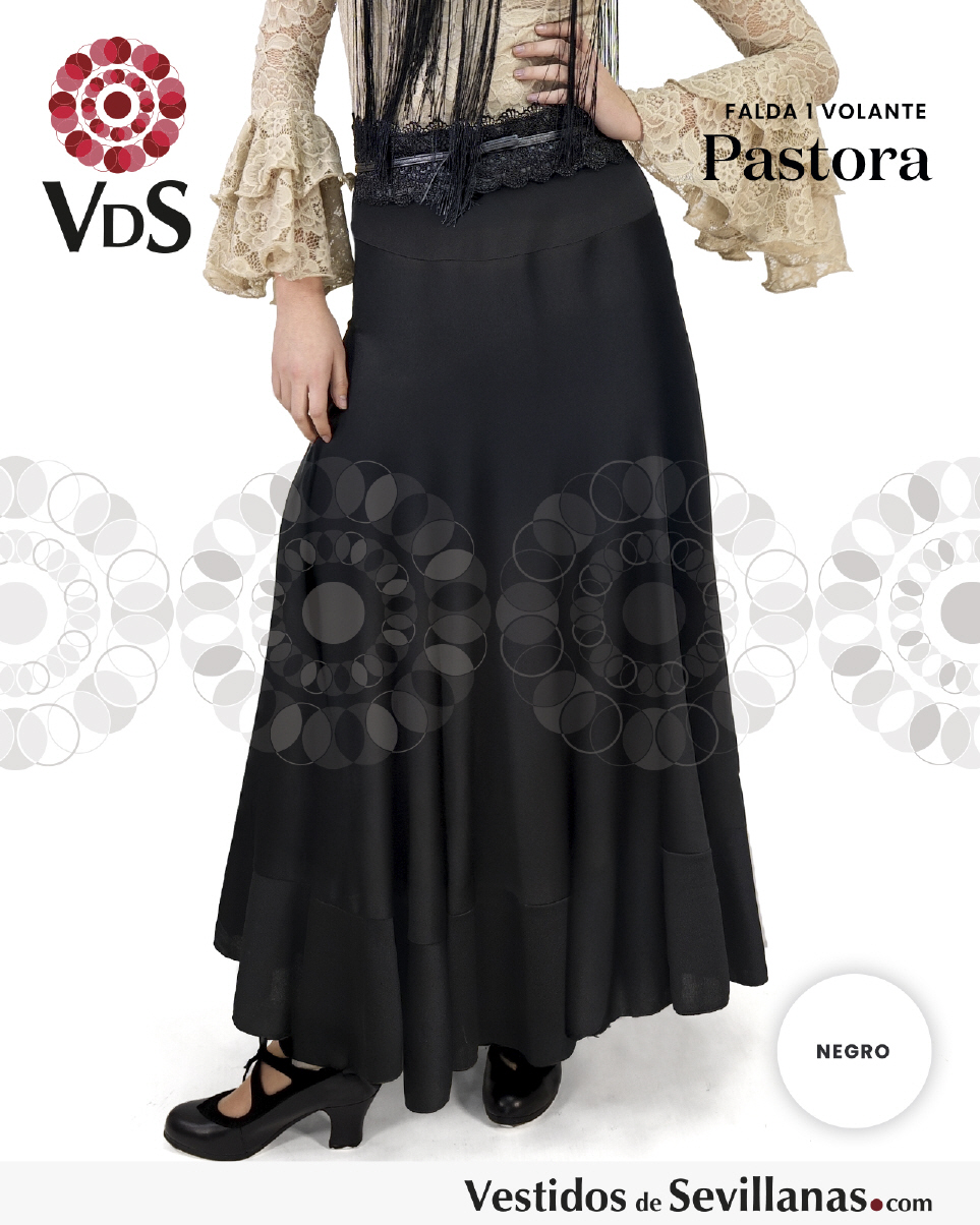 Falda PASTORA para baile flamenco de capa entera con dos volantes, pieza triangular en la cadera para un perfecto ajuste.