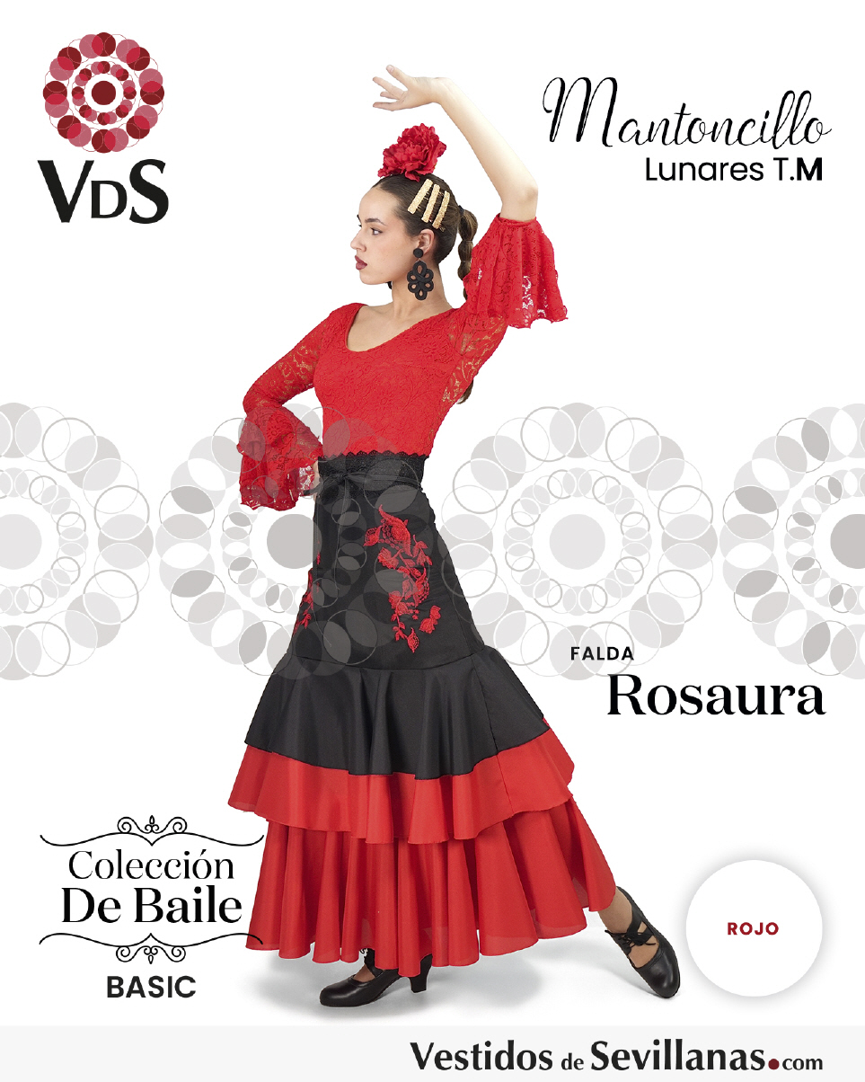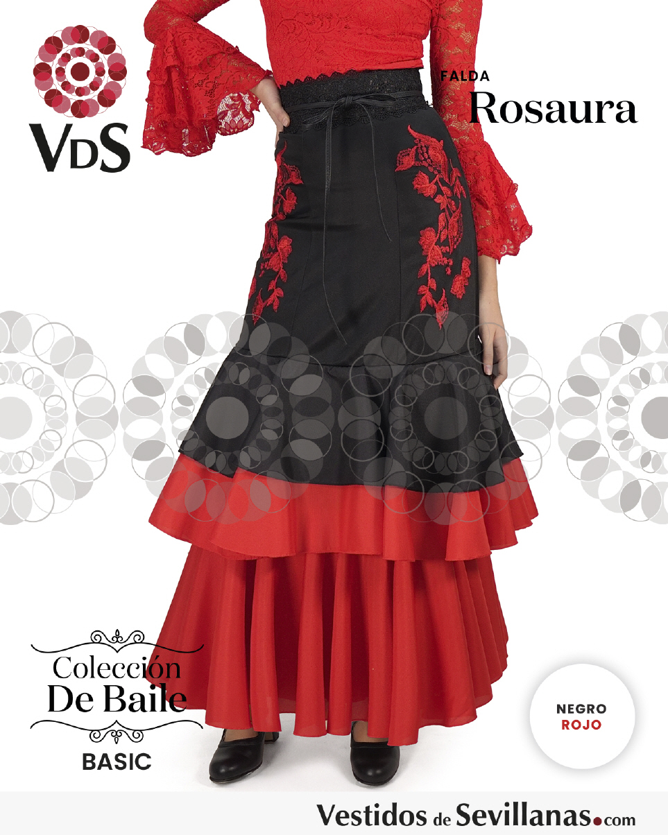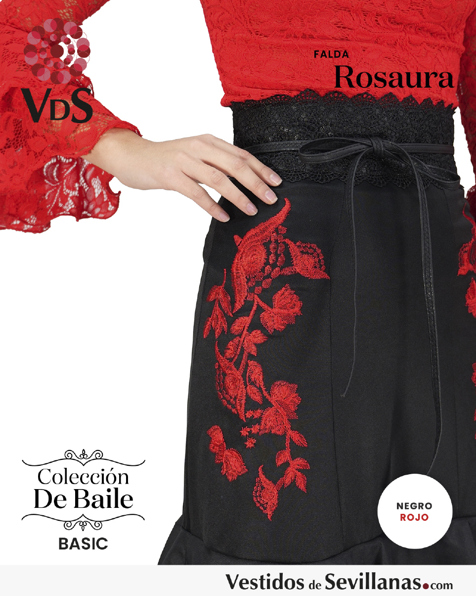 Falda ROSAURA para baile flamenco entallada a cadera en color negro/rojo, con flores bordadas en la cadera.