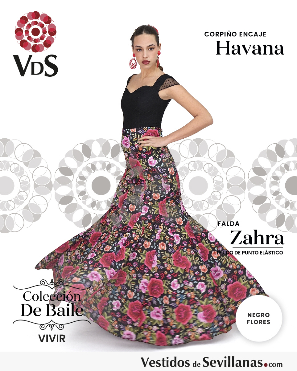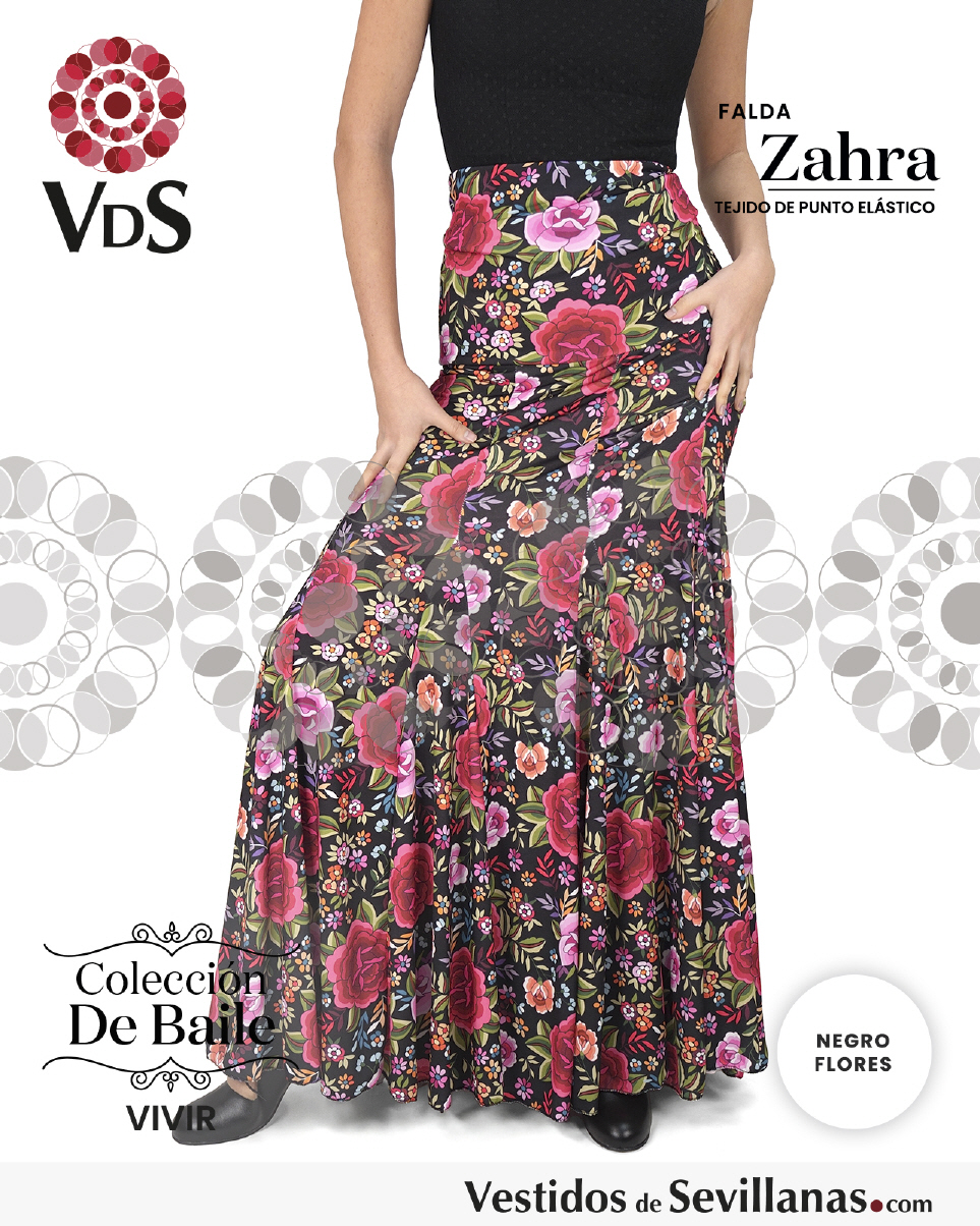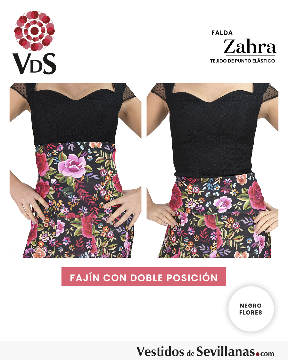 Falda ZAHRA Talle Alto. Falda entallada en color Negro con flores Multicolor (sin forro).
