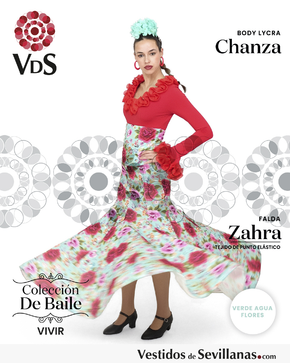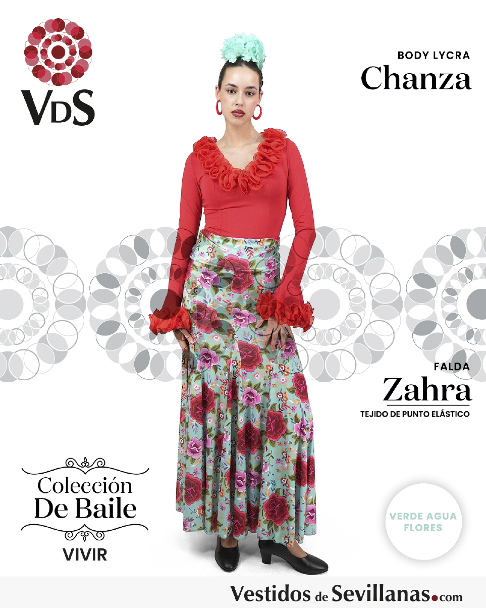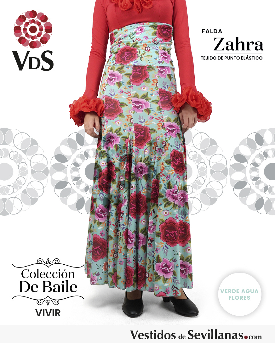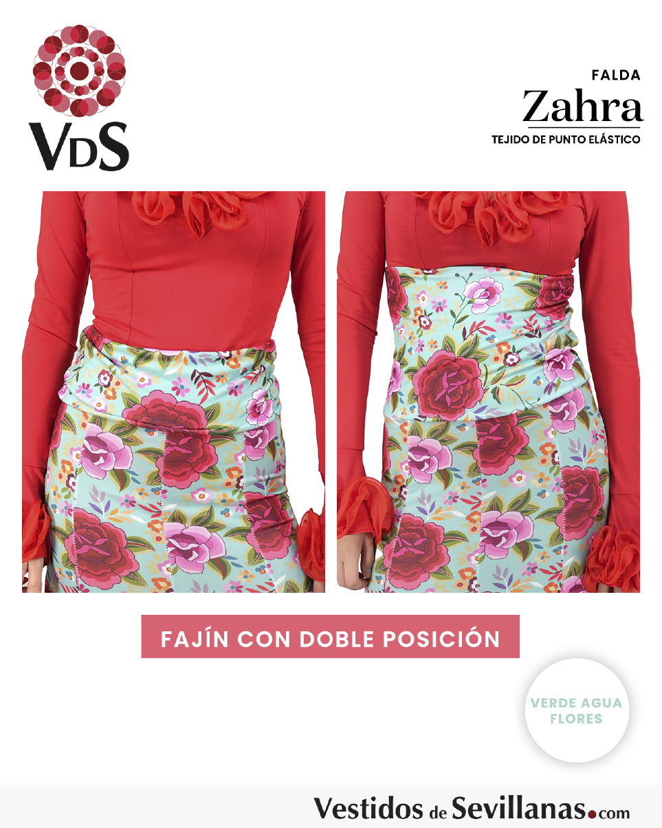 Falda ZAHRA Talle Alto. Falda entallada en color Verde Agua con flores Multicolor (sin forro).