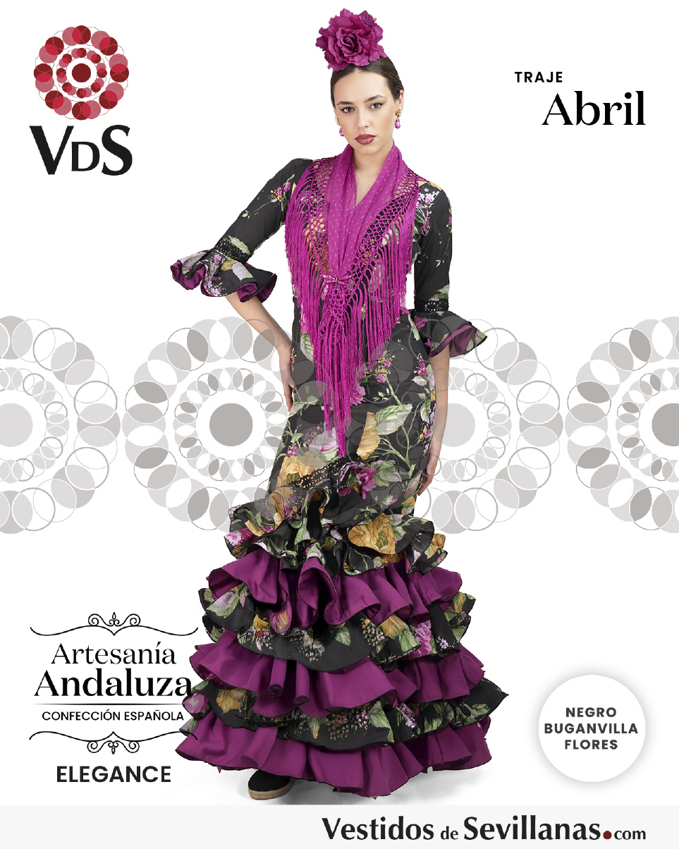 Traje de flamenca ABRIL Vestido entallado con manga, falda cascada con siete volantes.