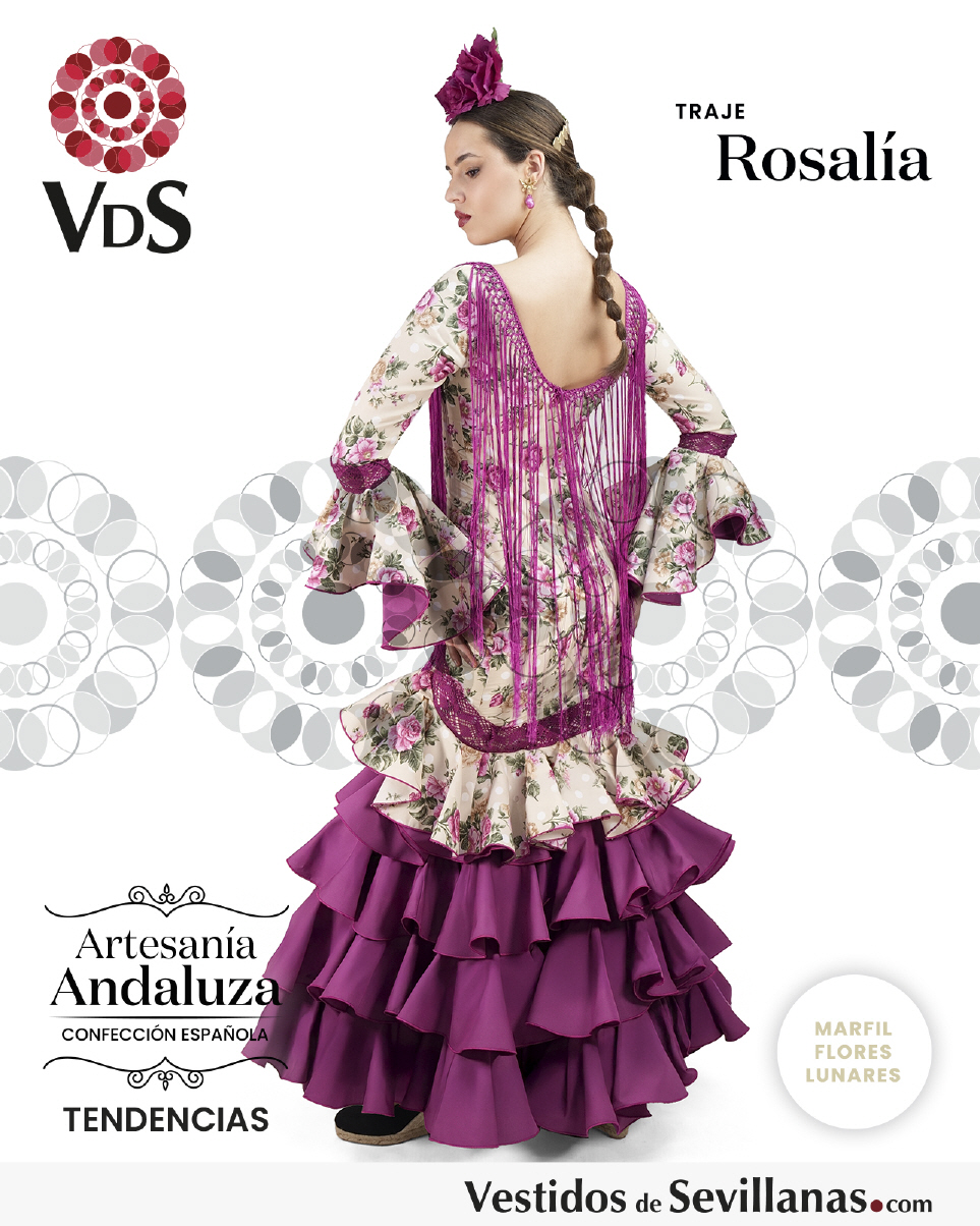 Traje de flamenca ROSALÍA Vestido entallado con manga forma pera, falda cascada con cinco volantes.