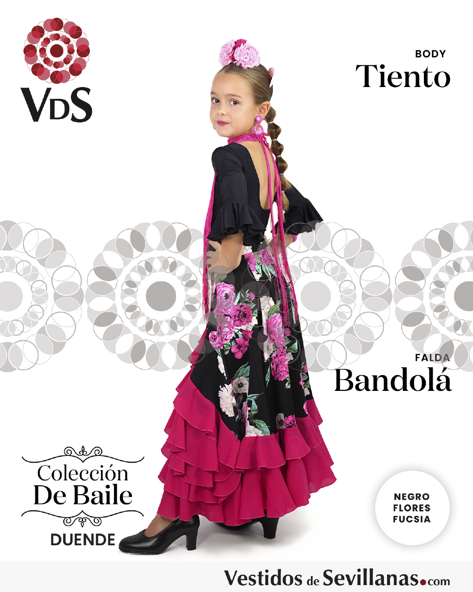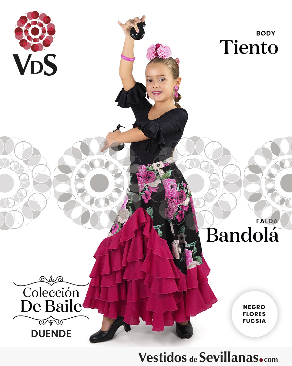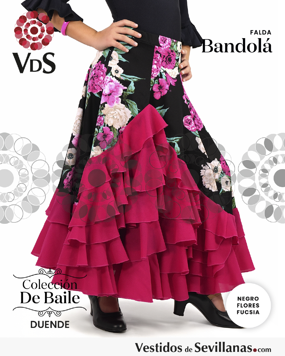 Falda BANDOLÁ con mucho vuelo, cascado de 5 volantes en color negro/rosa. con flores multicolor.