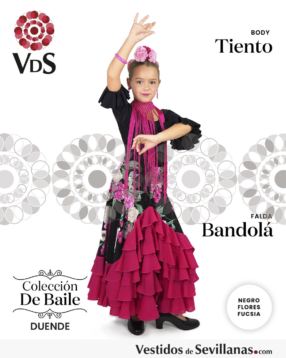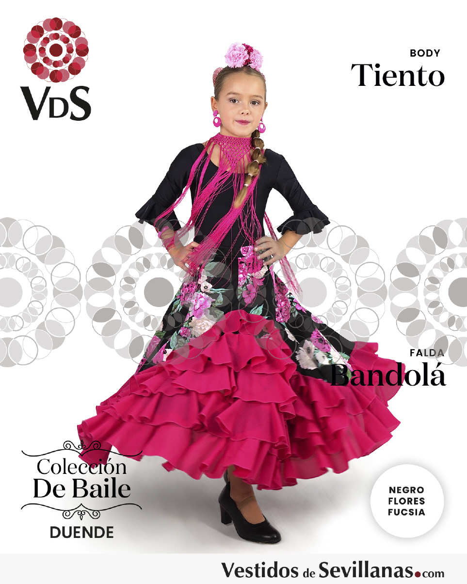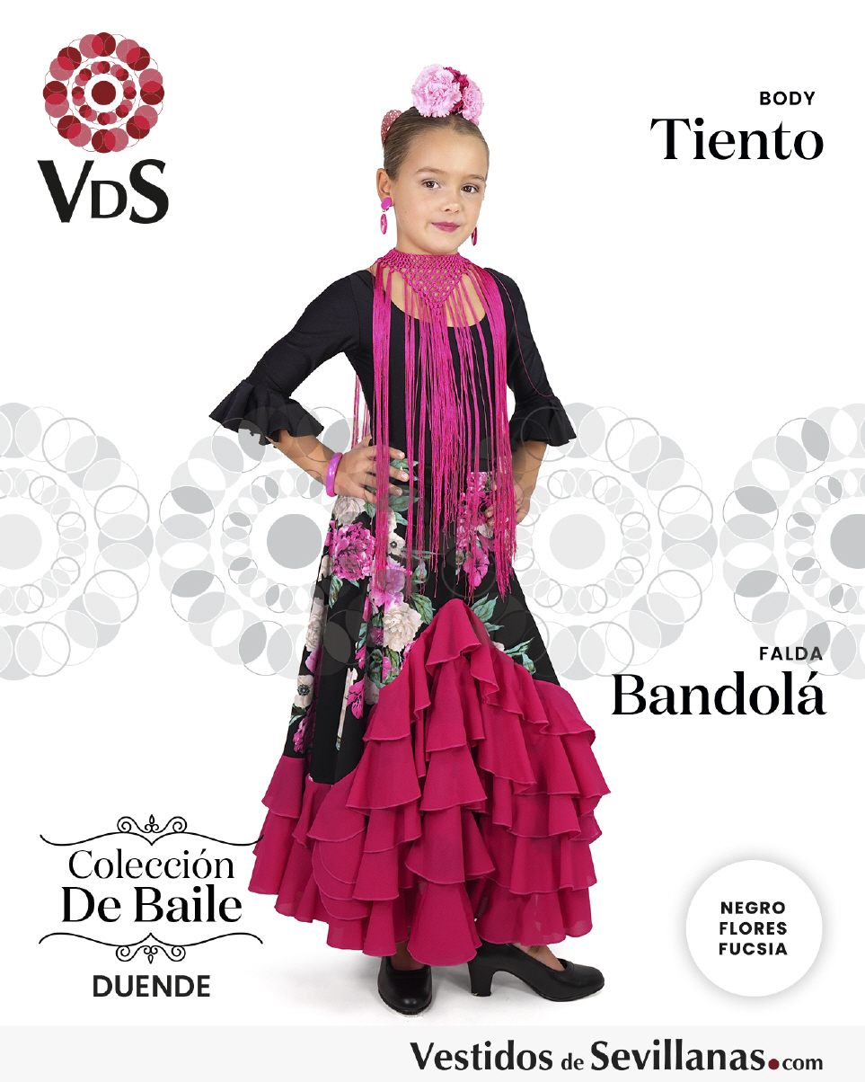 Falda BANDOLÁ con mucho vuelo, cascado de 5 volantes en color negro/rosa. con flores multicolor.