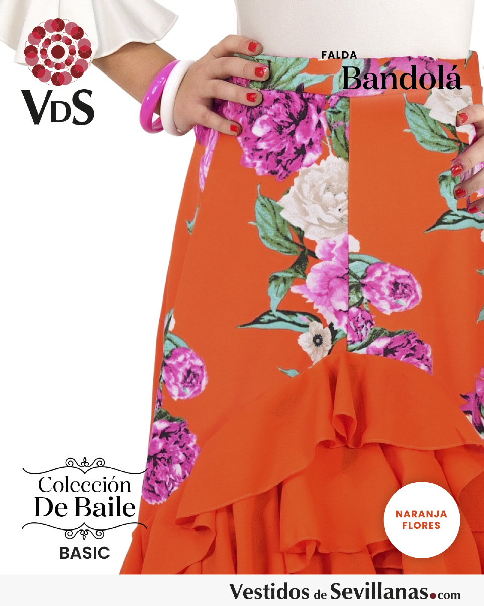 Falda BANDOLÁ con mucho vuelo, cascado de 5 volantes en color negro/naranja. con flores multicolor.