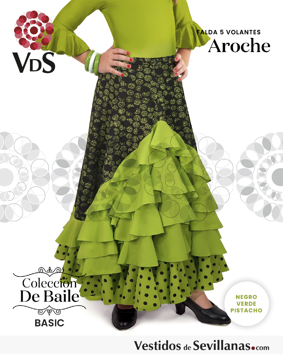 Falda flamenca AROCHE para Niña, cinco volantes color negro/verde pistacho, estampado y lunares pequeños verde pistacho.