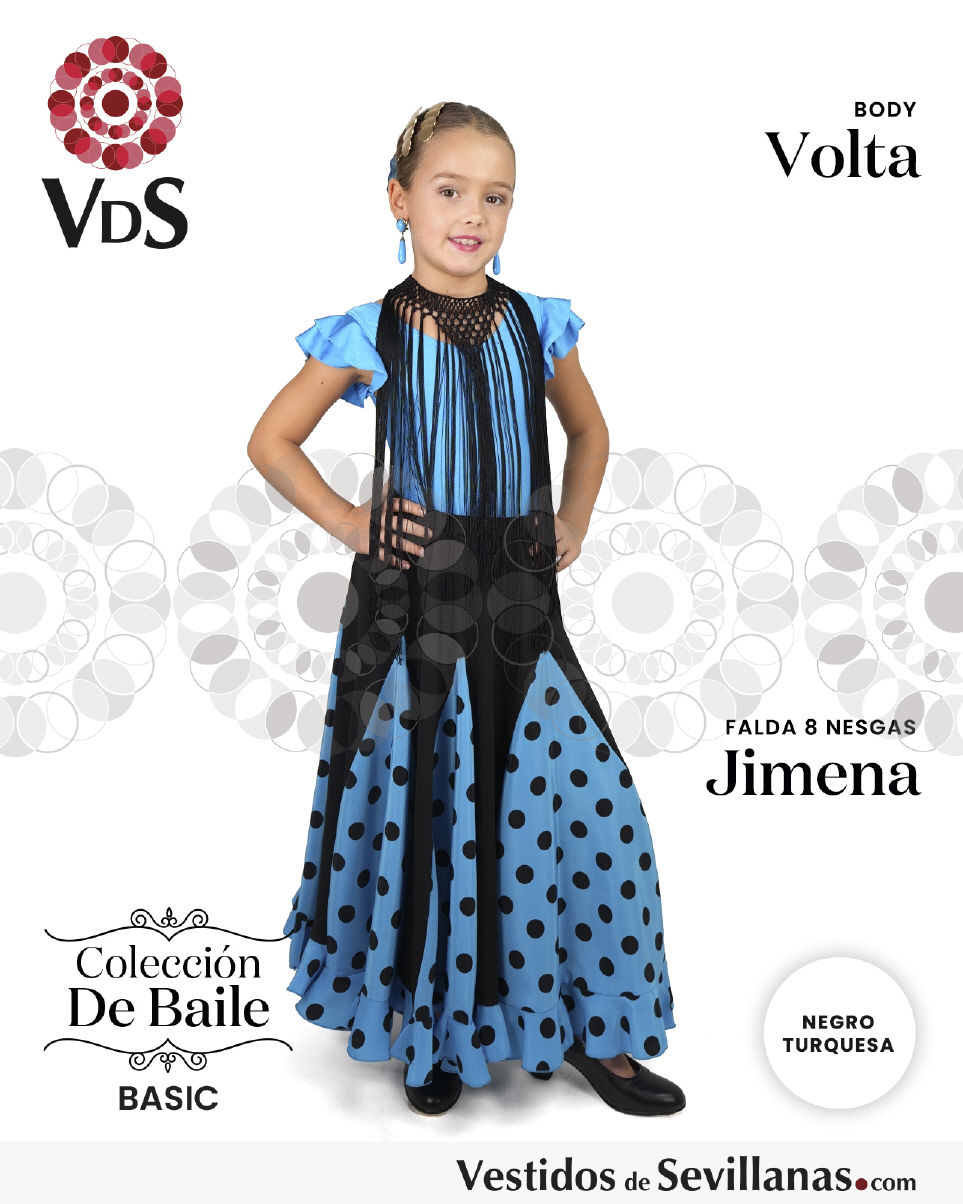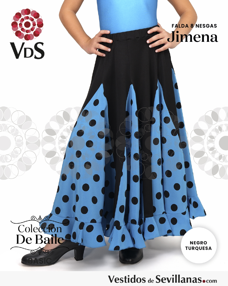 Falda JIMENA para baile flamenco infantil, ocho nesgas con un volante, lunares medianos estampados.