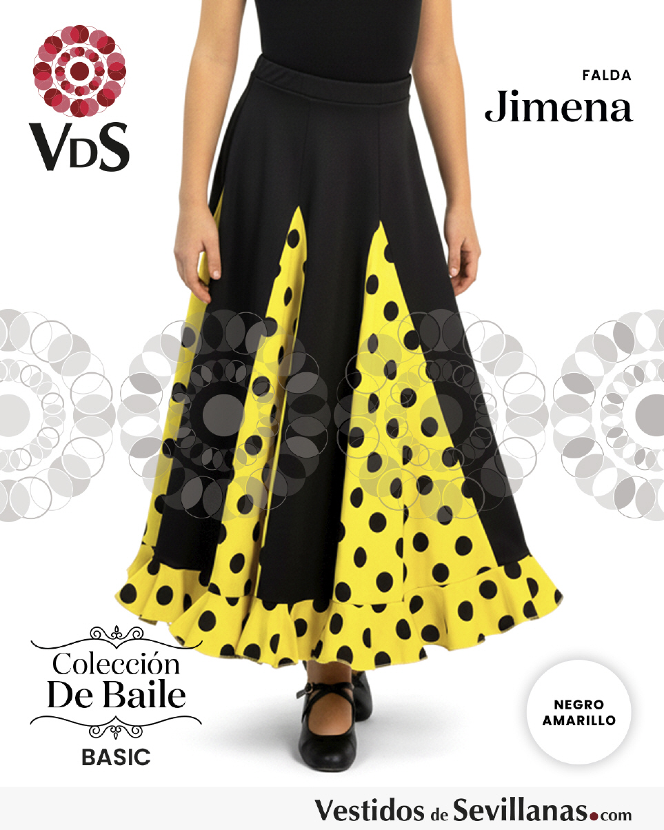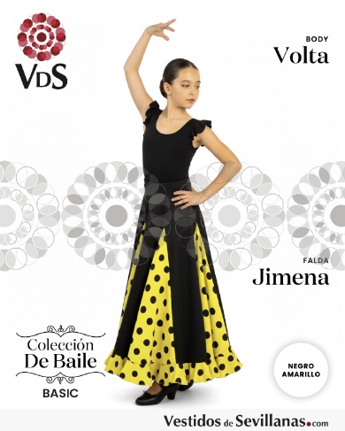 Falda JIMENA para baile flamenco infantil, ocho nesgas con un volante, lunares medianos estampados.