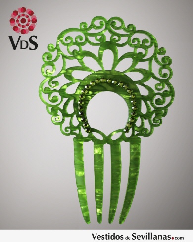Peineta decorada con pedrería, forma redonada, con cristales cortados. Fabricado en símil de nácar, plástico. disponible en un amplia gama de colores.