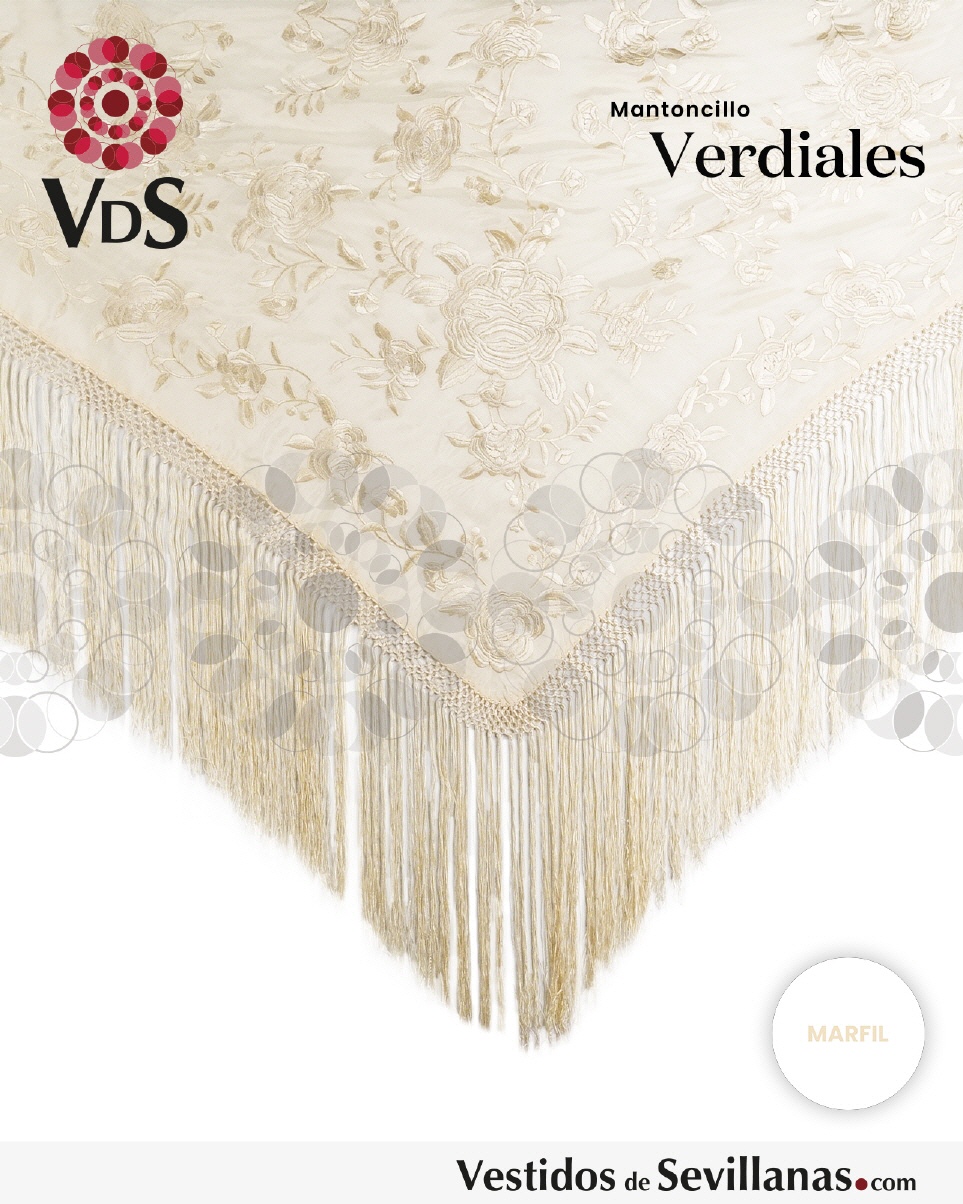 Mantoncillo / Pico VERDIALES bordado en color Beige/Marfil, flores y flecos en Beige.