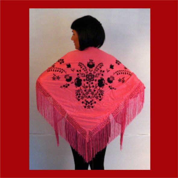 Mantón con Flores Bordadas señora color rosa fucsia y flores negras con flecos, tejido sedoso.