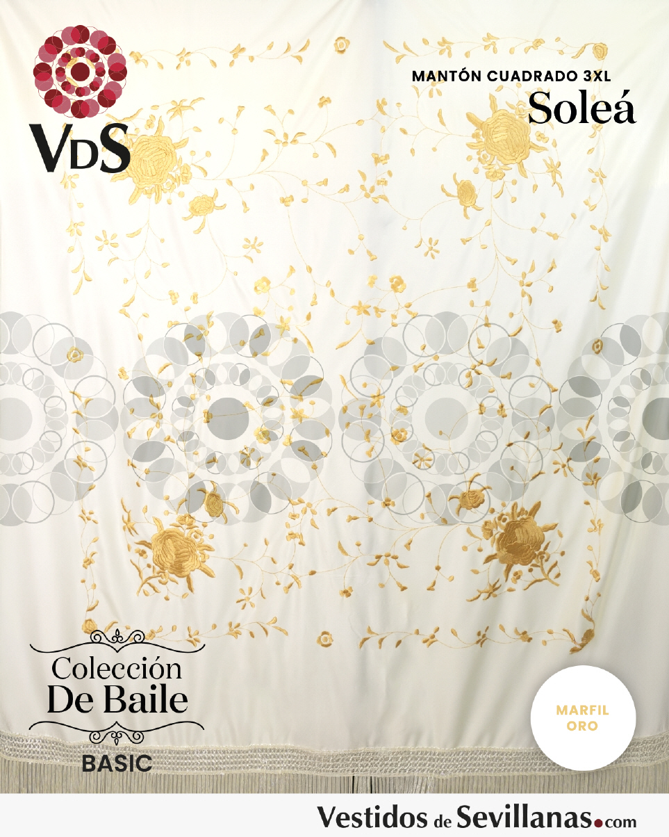 Mantón SOLEÁ bordado grande cuadrado con flecos, Marfil con flores bordadas color Oro.