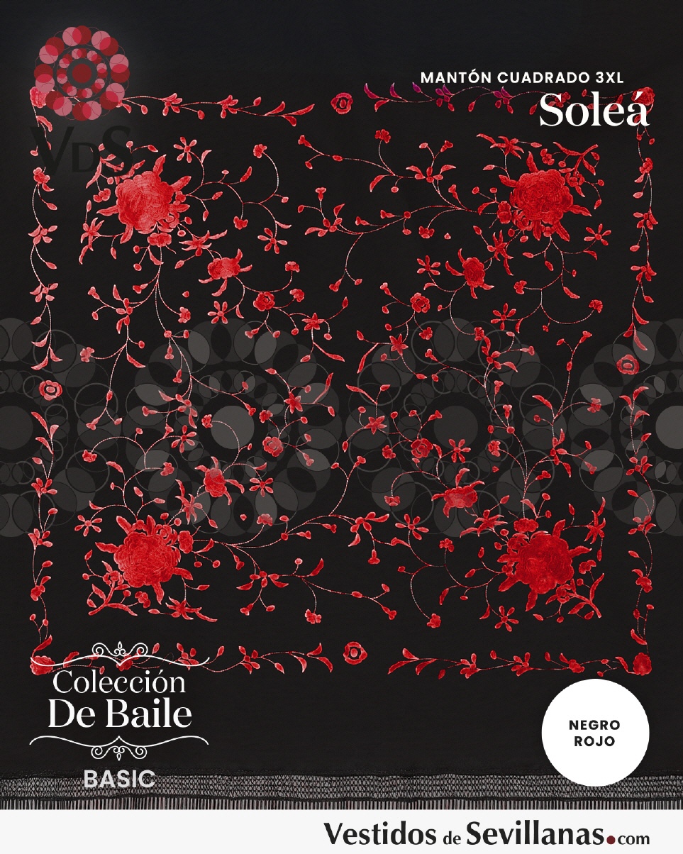Mantón SOLEÁ bordado grande cuadrado con flecos, negro con flores bordadas rojas.