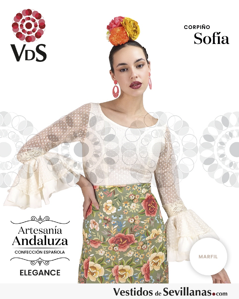 Corpiño SOFÍA flamenco Plumeti, escote barca, mangas con volantes.