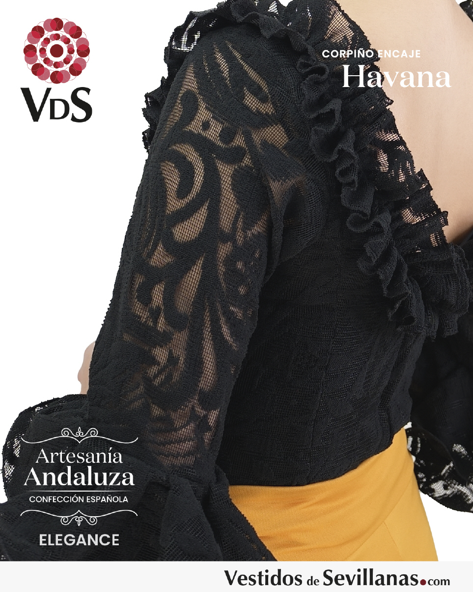Corpiño HAVANA flamenco en encaje, escote barca, mangas con volantes.