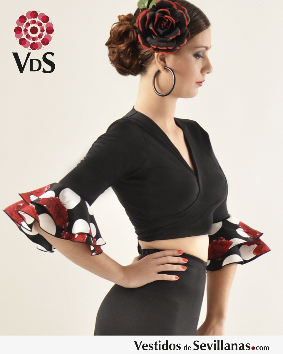 Bolero Mod.BARAS para mujer en color negro, dos volantes en Crespón estampado con flores rojas y lunares blancos. Tejido de punto indesmallable y volantes en Crespón 100%poliéster.