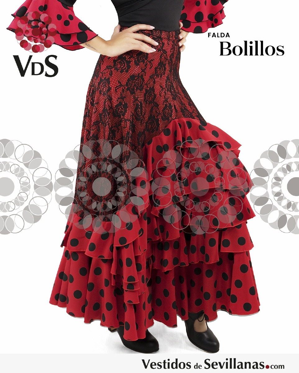 Falda BOLILLOS para baile flamenco con mucho vuelo, 5 volantes.