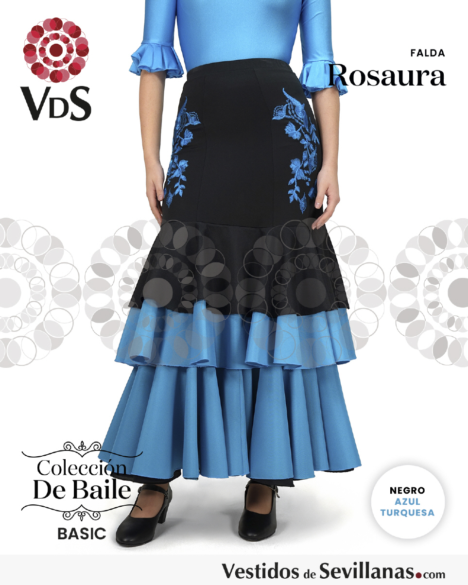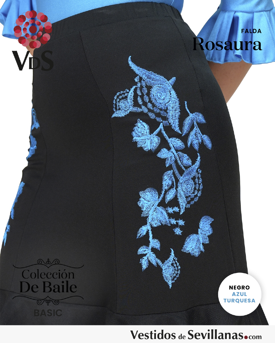 Falda ROSAURA para baile flamenco entallada a cadera en color negro/rojo, con flores bordadas en la cadera.
