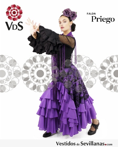 Falda PRIEGO para baile flamenco con mucho vuelo, 5 volantes lilas en cascada, con rosas estampadas.