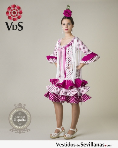 Traje de Flamenca mujer con manga, corto en Popelín Mod. Málaga vestido con tirante ancho, en color buganvilla/blanco con lunares en los volantes en color buganvilla. Cremallera en la espalda, falda tres volantes viveteados.